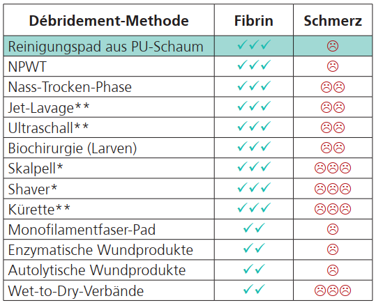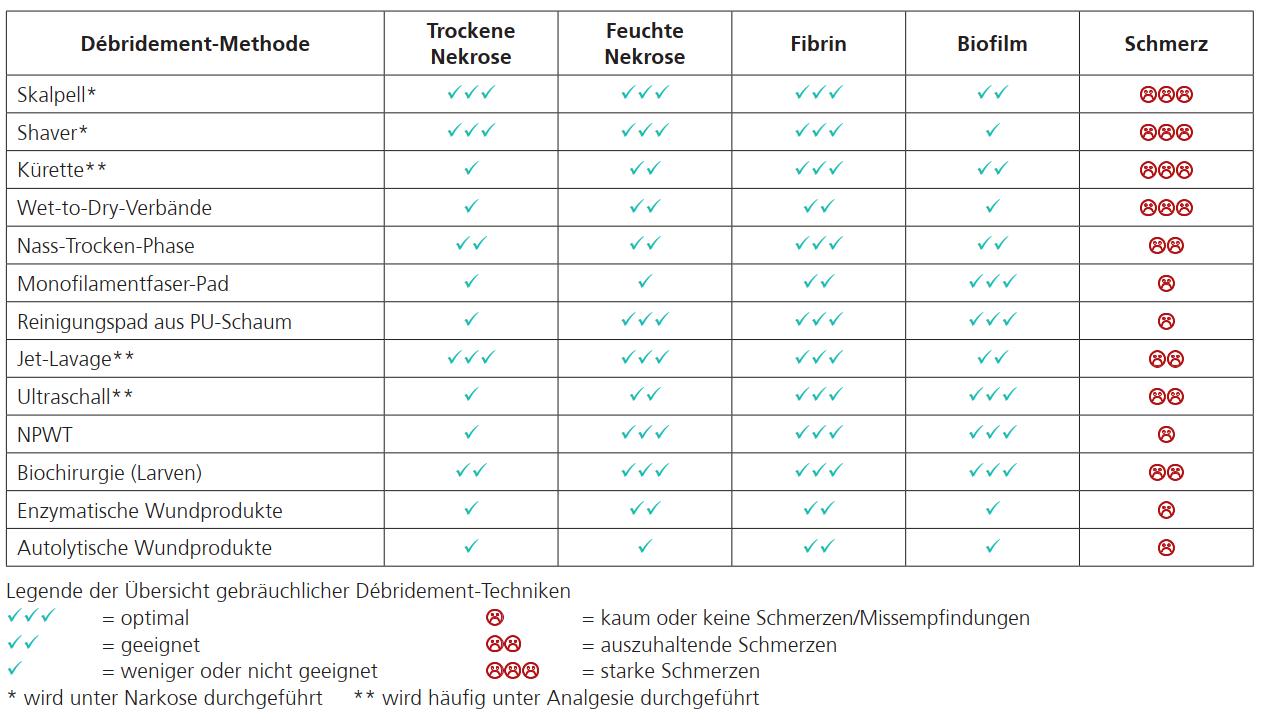 Ausgenommen sind trockene Nekrosen, die üblicherweise mit dem Skalpell entfernt oder alternativ vorher entsprechend angeweicht werden. Eine empfohlene Auswahl finden Sie in der nachfolgenden Tabelle.